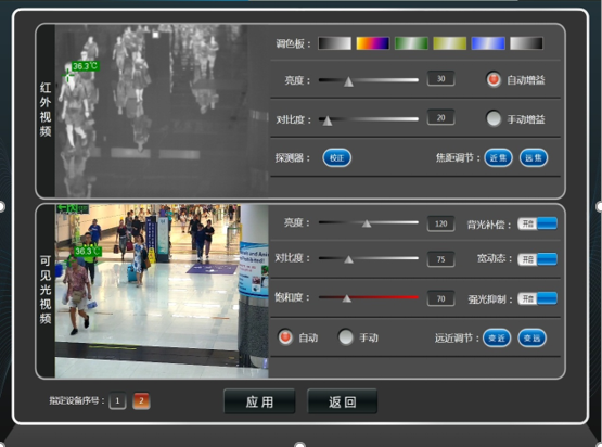 2、軟件:配套完全自主開發(fā)的系統(tǒng)軟件“紅外智能體溫監(jiān)控系統(tǒng)”,自主設(shè)計(jì)、操作簡便的軟件系統(tǒng)主界面,各項(xiàng)參數(shù)設(shè)置界面,具備獨(dú)特的系統(tǒng)功能,例如:系統(tǒng)狀態(tài)自檢功能,包括對(duì)黑體狀態(tài)、環(huán)境參數(shù)、網(wǎng)絡(luò)狀態(tài)等參數(shù)的自動(dòng)檢測;根據(jù)系統(tǒng)反饋參數(shù)自適應(yīng)調(diào)整,歷史記錄瀏覽,報(bào)警圖片推送,高清視頻信號(hào)后傳,人臉識(shí)別誤報(bào)警排除等多項(xiàng)功能;同時(shí)能夠支持后臺(tái)數(shù)據(jù)接口對(duì)其他數(shù)據(jù)系統(tǒng)平臺(tái)開放對(duì)接,包括與海關(guān)的智慧衛(wèi)檢系統(tǒng)對(duì)接功能、旅客艙單系統(tǒng)對(duì)接功能等,并且由于完全自主開發(fā)系統(tǒng)軟件,可支持免費(fèi)升級(jí)和調(diào)整定制的海關(guān)各種定制化需求。