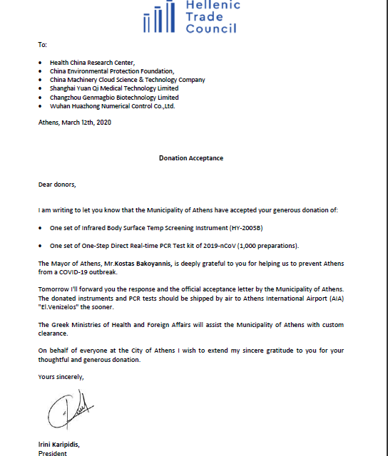 當(dāng)前,新冠肺炎疫情正在全球多個國家蔓延擴散。截止3月20日,希臘共和國累計確診新冠肺炎病例增加到近500例。面對新冠疫情快速蔓延,希臘共和國總理米佐塔基斯稱“希臘處于戰(zhàn)爭狀態(tài),但我們必將獲勝”。他強調(diào)當(dāng)前希臘政府的首要任務(wù)是“挽救生命”,希臘共和國政府已經(jīng)出臺一系列措施進行防疫抗疫。3月20日,在中華環(huán)境保護基金會的協(xié)調(diào)下,武漢華中數(shù)控股份有限公司(簡稱華中數(shù)控)通過希臘共和國駐中華人民共和國大使館,向希臘共和國捐贈一臺HY-2005B紅外智能測溫儀,支援希臘共和國政府開展防疫抗疫工作。為此,雅典市市長專門發(fā)來感謝信,感謝華中數(shù)控為希臘疫情防控提供幫助,據(jù)悉,本次捐贈的紅外智能測溫儀將用于雅典國際機場海關(guān)旅客的體溫檢測。