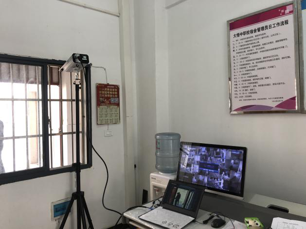 這幾天,大悟縣第一中學、大悟縣中等職業(yè)技術學院兩所學校都可以看到一個“黑科技”:一個紅外攝像頭,一臺筆記本。從攝像頭走過的人,都會被拍進筆記本顯示屏中,同時,人像的頭部會出現(xiàn)測量的體溫數(shù)據(jù)。?